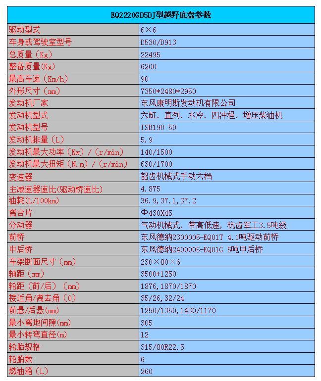 潤知星牌SCS5220XXYEQ型廂式運輸車簡介:六驅(qū)越野箱式應急保障車采用東風EQ2220GD5DJ型越野汽車底盤,東風D530寬體一排半駕駛室,帶空調(diào),6*6驅(qū)動,康明斯190馬力發(fā)動機正宗國五,機械式六檔變速箱,315/80R22.5 越野輪胎,帶備胎,ABS,標準車廂尺寸:4900×2400×2200(mm)。