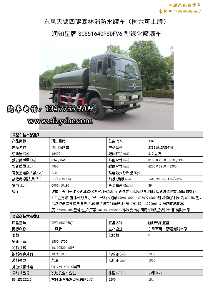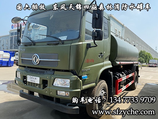 東風(fēng)天錦四驅(qū)森林消防灑水車_國六排放潤知星牌SCS5164GPSDFV6型四驅(qū)越野綠化噴灑車采用DFV2163GP6DJ型國六排放東風(fēng)天錦四驅(qū)越野底盤,東風(fēng)天錦D530一排半駕駛室,4×4驅(qū)動,康明斯B6.2NS6B210國六發(fā)動機(jī)210馬力,最大扭矩850N.m/1100-1700rpm,排量6.2L、韶齒手動六檔變速箱,東風(fēng)德納車橋,前驅(qū)動橋4.5噸,后橋10噸,10.00R20輪胎,軸距4500mm/4700mm,電動玻璃,方向助力,斷氣剎,ABS,大燈自動調(diào)節(jié),自動調(diào)整臂,選裝原廠空調(diào)。罐體采用優(yōu)質(zhì)碳鋼Q235板材,板材厚度4mm,罐體容積8.7立方,安裝夾心取力器,后置泵箱,消防栓接口左右各一個(gè),消防炮采用PS30-50D消防水炮,流量40L/S/1.0MPa 水射程:≥50m,消防泵采用常壓消防泵型號:CB10/40車用消防泵,流量:40L/s,壓力:1.0MPa,駕駛室頂部安裝長條警燈帶喊話器,兩側(cè)噴涂白色森林消防字樣。