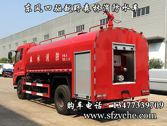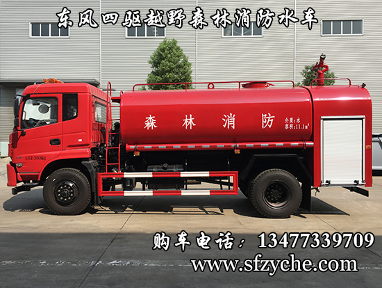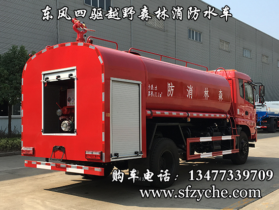 東風(fēng)新款四驅(qū)越野森林消防灑水車_東風(fēng)11.1噸四驅(qū)消防水車_國五四驅(qū)越野森林滅火水車_東風(fēng)4×4越野SCS5183GPSEQ型四驅(qū)綠化噴灑車簡介:采用東風(fēng)EQ2180GD5DJ型越野汽車底盤,東風(fēng)D913新款駕駛室,4×4驅(qū)動,康明斯ISB190 50國五發(fā)動機(jī),六檔變速箱,東風(fēng)商用車橋,前驅(qū)動橋3.8噸,后橋10噸,10.00R20輪胎,軸距4500mm,電動玻璃,方向助力,斷氣剎,ABS。罐體采用優(yōu)質(zhì)碳鋼Q235板材,板材厚度4mm,罐體容積11.1立方,安裝夾心取力器,后置泵箱,消防栓接口左右各一個(gè),消防炮采用PS30-50D消防水炮,流量40L/S/1.0MPa 水射程:≥50m,消防泵采用常壓消防泵型號:CB10/40車用消防泵,流量:40L/s,壓力:1.0MPa,帶前沖,駕駛室頂部安裝長條警燈帶喊話器,全車顏色橘紅,兩側(cè)噴涂白色森林消防字樣。