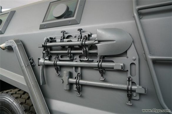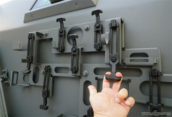 上圖是東風四驅(qū)防雷反恐戰(zhàn)車右前側(cè)圍懸掛附加工具或補給品的懸掛特寫。用手較費勁的抻拉橡膠懸掛鎖具。備用工具通過橡膠掛具與背板固定在車身側(cè)面,背板拆卸后可以成為盤等工具。