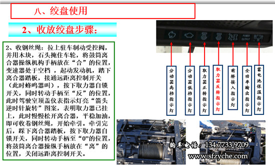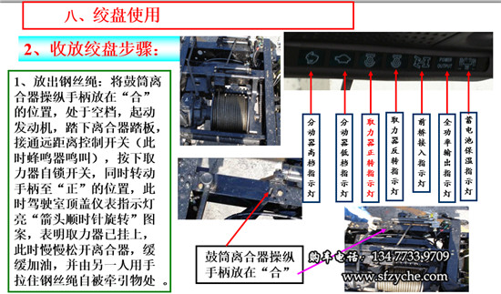 1、放出鋼絲繩:將鼓筒離合器操縱手柄放在“合”的位置,變速器處于空檔,起動(dòng)發(fā)動(dòng)機(jī),踏下離合器踏板,接通遠(yuǎn)距離控制開(kāi)關(guān)(此時(shí)蜂鳴器鳴叫),按下取力器自鎖開(kāi)關(guān),同時(shí)轉(zhuǎn)動(dòng)手柄至“正”的位置,此時(shí)駕駛室頂蓋儀表指示燈亮“箭頭順時(shí)針旋轉(zhuǎn)”圖案,表明取力器已掛上,此時(shí)慢慢松開(kāi)離合器,緩緩加油,并由另一人用手拉住鋼絲繩自被牽引物處 。