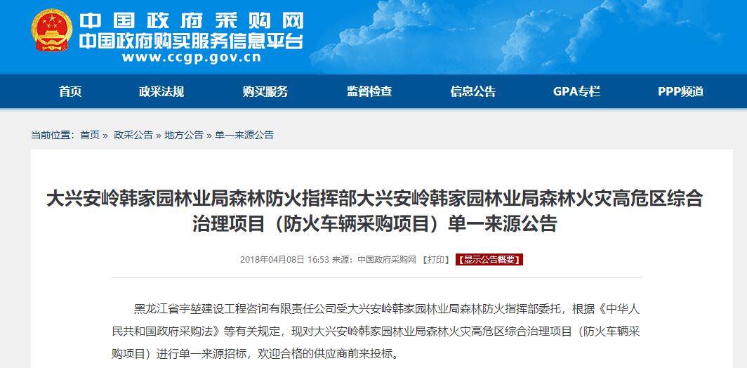 據(jù)林業(yè)局領(lǐng)導(dǎo)介紹,該批車輛到達(dá)林業(yè)局后下發(fā)至林業(yè)局防火辦,主要用于森林滅火人員物資輸送,后勤保障救援,防火器材運(yùn)輸?shù)戎饕ぷ鳎虼藢囕v的質(zhì)量要求極其嚴(yán)格,對我們公司提供的防火車輛給出高度評價,此批車輛為韓家園林業(yè)局經(jīng)過層層篩選,反復(fù)招投標(biāo)后才確定的車型,公司接到中標(biāo)通知書時也是很激動,能接上這樣的森林防火設(shè)備運(yùn)輸車,也對我們的服務(wù),質(zhì)量提出更高的要求。該局領(lǐng)導(dǎo)介紹由于林區(qū)防火公路多為簡易道路,對車輛通過性要求很高,我公司提供的四驅(qū)越野卡車能夠滿足他們的需求。下圖為招標(biāo)公示。