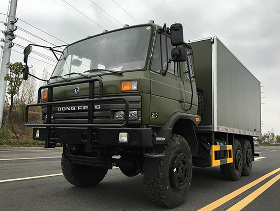 東風(fēng)六驅(qū)越野廂式車采用東風(fēng)越野卡車底盤DFS5160GLJ2 ,東風(fēng)153平頭一排半駕駛室,6*6驅(qū)動(dòng),康明斯210馬力,韶齒6檔變速箱,斷氣彈簧制動(dòng),貫通式中后驅(qū)動(dòng)橋,12.5R20越野胎,軸距 3500+1250mm,加厚雙層大梁,帶軍用保險(xiǎn)杠。六驅(qū)越野廂式車,廂體根據(jù)用戶需要形式多樣,選裝多樣,可以選裝空調(diào)、側(cè)門、側(cè)窗、發(fā)電機(jī)、裙邊結(jié)構(gòu)等.